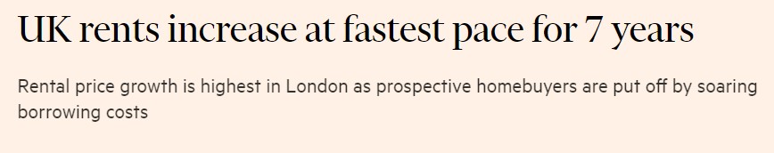 As mortgages go up, so rents will follow. “Annual rental prices in the UK” the Financial Times reported, “rose 5 per cent in May, the highest rate for seven years…” (June 21). For hundreds of thousands of young couples particularly, housing is getting further and further out of reach. They cannot afford to buy or rent.
