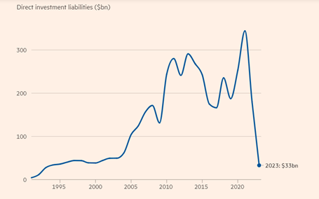 Ah, but you see, manufacturing is in recession (as measured by official surveys), consumption is weak (still below pre-pandemic levels) and foreign investment, seen as the life-blood for the Chinese economy has dried up.