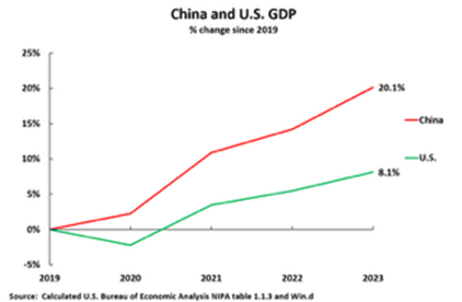In a recent article, John Ross has shown that to achieve China’s Plan GDP target for 2025 ie a doubling GDP from 2021, it would require an average annual growth of 4.7% a year. So far, China is ahead of this goal with annual average growth in 2020-2023 of about 5%. Indeed, since the beginning of the pandemic, China’s economy has grown by 20.1% and the U.S. by 8.1%—that is China’s total GDP growth since the beginning of the pandemic has been two and half times greater than the US.