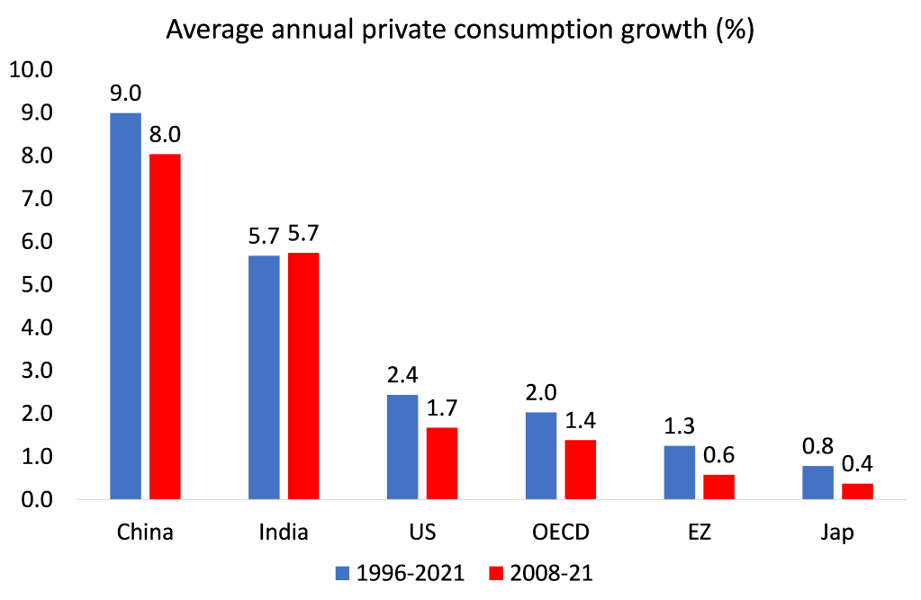 China has not had a contraction in national income in any year since 1976, while the consumer-led G7 economies have had slumps in 1980-2, 1991, 2001, 2008-9 and 2020. Much has been made of China’s ‘disastrous’ zero COVID policy. But apart from saving millions of lives, China still did not enter a slump in 2020, unlike all the G7 economies in 2020.