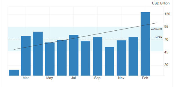 Western experts go on about the size of China’s export surplus, namely that the current account (the balance of receipts from abroad against payments), claiming that the surplus is as high as 4% of China’s GDP. And China’s exports are 15% of the world total. And just in the last month exports rose over 7% so that China’s balance of trade with the rest of the world reached an all-time high of $125bn in February.