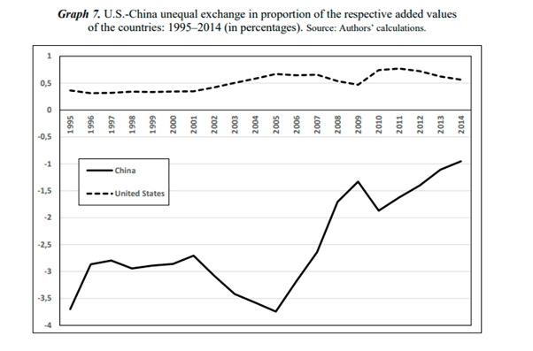 However, as China’s ‘technology deficit’ with the US began to narrow in the 21st century, US UE gains began to disappear. “China has indeed succeeded in significantly reducing the importance of this unequal exchange, with its disadvantage in the transfer of wealth gradually diminishing: the proportion of this unfavorable transfer in the Chinese added value fell from -3.7 percent to -0.9 percent between 1995 and 2014. As a matter of fact, China had to trade fifty hours of Chinese labor for one hour of U.S. labor in 1995, but only seven in 2014.”