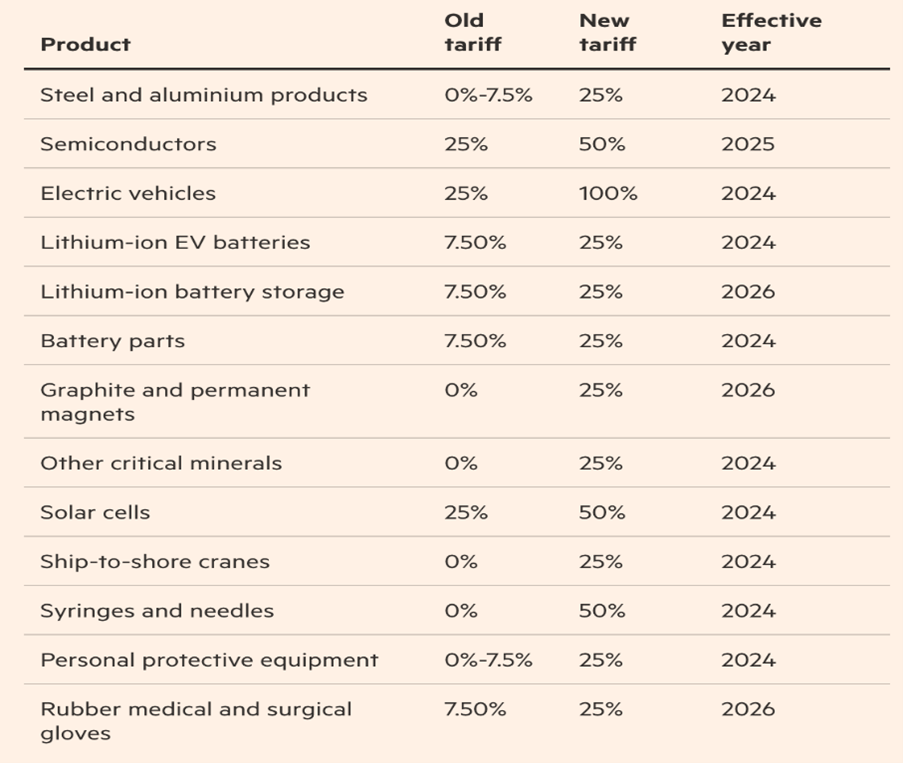 The US government announced a new series of protectionist measures on Chinese goods imported into the US. It included a quadrupling of the tariff rate to 100% on Chinese electric vehicle (EV) imports, doubling the levy on solar cells and more than tripling the fee on Chinese lithium-ion EV batteries. These tariffs are equivalent to an annual $18bn of Chinese goods on top of the previous $300bn slapped down under Trump.