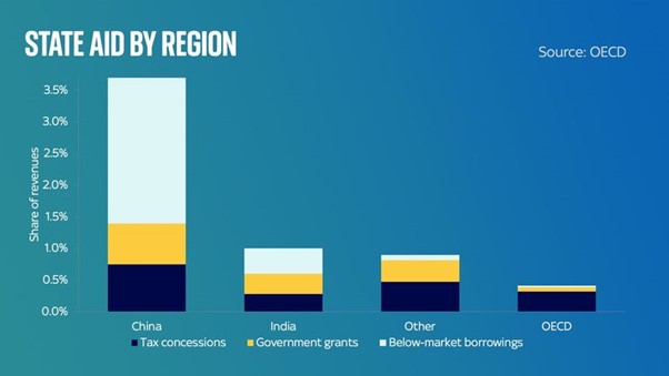 There is a big difference in the nature of ‘industrial policy’ in China and that of the US. According to an unpublished study by the OECD, Chinese state aid to Chinese companies is nine times the size of the state aid in OECD nations. Chinese businesses benefit from government subsidies equivalent, on average, to 3.7% of their revenues. This compares to average state aid of only 0.4% of revenues for countries in the ‘rich world’.