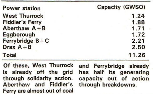 But although difficult, the task of shutting power stations was not impossible. The key power stations were the coal-fired stations outside the Midlands area. It was calculated that coal stocks at these power stations were low, and that if no more coal were delivered, then they could run out by late January. If 100,000 tonnes were delivered per week and used, then they could last until February and if 200,000 tonnes were delivered then they could last until March [Militant 11 January].