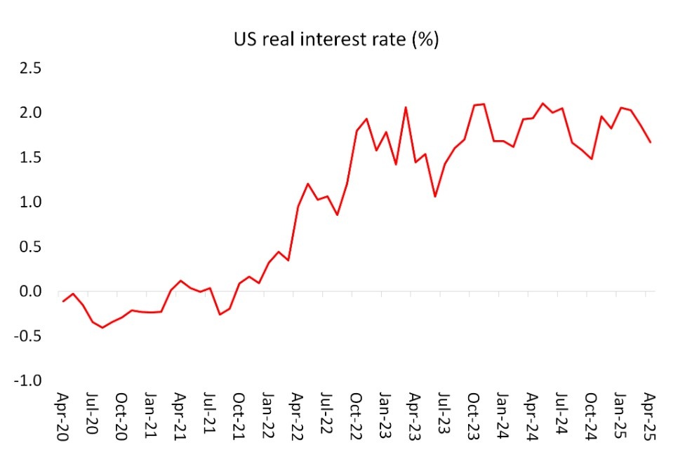 However, the low interest rate environment for companies in the 2010s has come to an end. Real interest rates (ie. after inflation is deducted) are at their highest level since just before the global financial crash in 2008. That suggests to me that if Trump’s tariff war starts hitting corporate revenues in the US and elsewhere and at the same time inflation rises and interest rates follow, then the squeeze on profits will tighten.