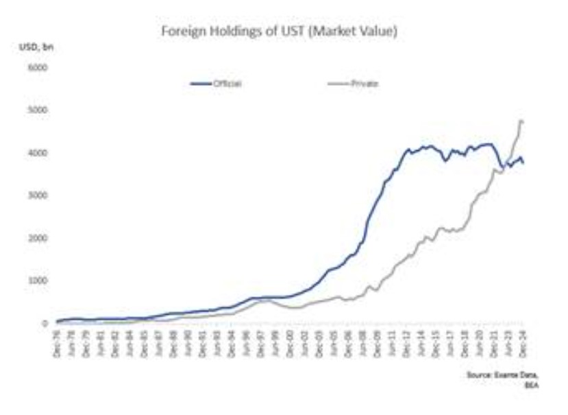 The dollar has fallen somewhat because private foreign holders (investment funds, corporates, banks etc), which now hold larger holdings than the central banks, have stopped buying. For years, official holders of the dollar (central banks round the world) have gradually stopped building their dollar reserves. But they have made no big moves to reduce them following Trump’s tantrums.