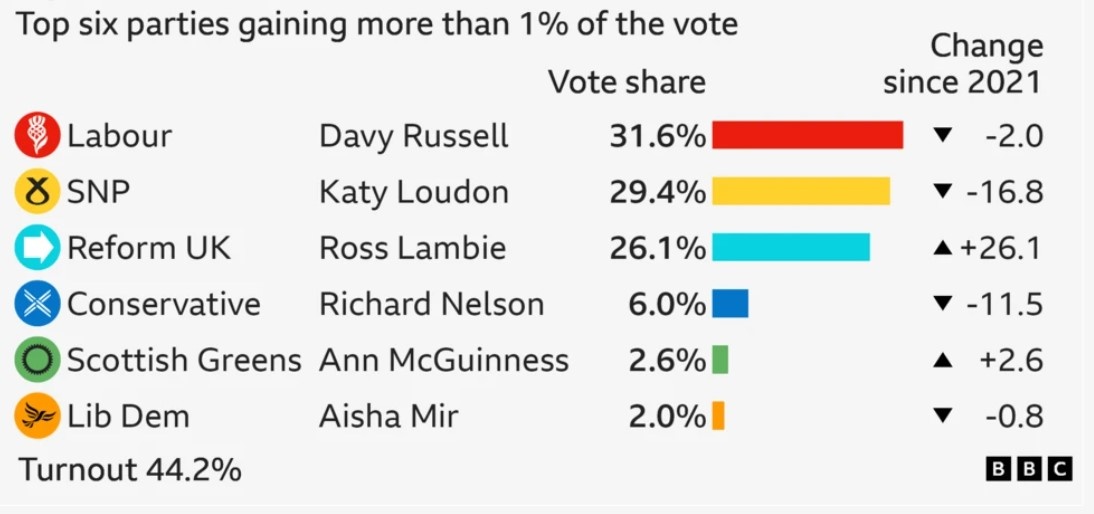 An indeterminate number of voters seem to have bought the SNP line of a ‘two-horse race’ between Reform and SNP…but voted Reform to defeat the SNP! Working class ‘Orange’ voters might have seen in the Rangers-supporting Labour candidate Davy Russell a man after their own heart.