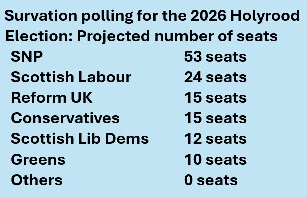 But eighteen years in Government are now beginning to weigh heavily on the SNP, with failures in transport, infrastructure, health and education building up. Their strategy of convincing the Scots of the value of independence through their example, as excellent administrators, is in seriously frayed, although pollsters still have them leading (so far) in the 2026 Holyrood election (see insert below).