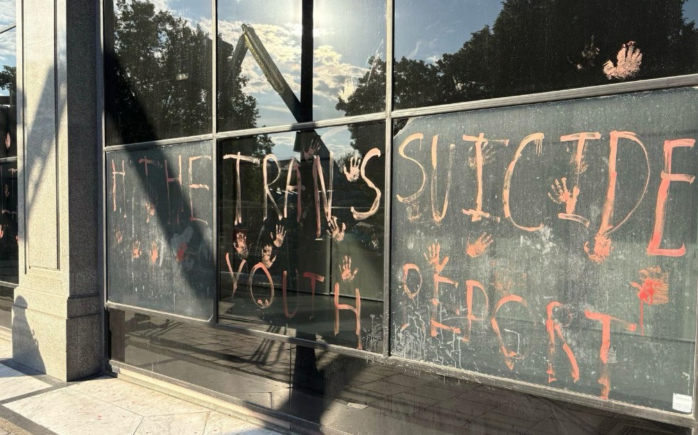 The group had previously left red hand mark on the front window of the NHS HQ, in protest at the deaths by suicide of trans kids denied treatment. They have also regularly targeted the office of Wes Streeting, leaving him painted cardboard “coffins”.