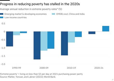 The World Bank goes on: “The poorest countries will suffer the most. By 2027, the per capita GDP of high-income economies will be roughly where it had been expected to be before the COVID-19 pandemic. (That’s not saying much – MR). But developing economies would be worse off, with per capita GDP levels 6 percent lower. Except for China, it could take these economies about two decades to recoup the economic losses of the 2020s.” In other words, far from the poorest countries making any progress in improving living standards for these most populated places, these countries are dropping further behind. Poverty rates (even those unrealistically set by the World Bank) are rising.
