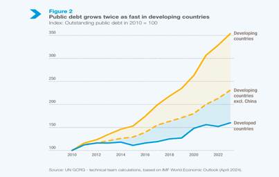 Total debt in the so-called emerging markets (EMs) excluding China rose by 3 percentage points of GDP in 2023 to reach 126 percent of GDP. Debt in low-income developing countries (LIDCs) also increased and is above pre-pandemic levels. Debt repayments are now greater than new inflows of credit and capital. In 2023, low- and middle-income countries (excluding China) experienced a net outflow to the private sector of $30bn on long-term debt — a major drain on development.