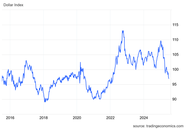 It’s true that the dollar has dropped against other major currencies to its lowest levels in three and half years since Donald Trump took office in January. His tariff tantrums and wild reversals have increased uncertainty in international trading and for investors about whether to hold their purchases and assets in dollars.