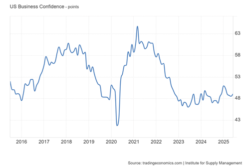 They show that, within the G7 top economies, Canada and the US economies are doing twice as well as the European economies. The economies of Europe are stagnating; it’s just that the US is beginning to join the stagnant European economies. The latest US real GDP data show a fall of 0.5%, while US manufacturing remains in contraction territory (below 50 on the graph).