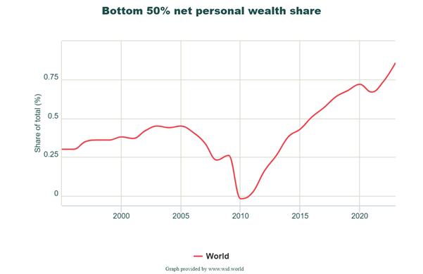 The wealth pyramid shows that just 60m adults, or 1.6% of all world’s adults, have net personal wealth of $226 trn, or 48.1% of all the world’s personal wealth. At the other extreme, 1.57bn adults (around 41% of the world’s adults) have only $2.7trn, or just 0.6% of all the world’s personal wealth! This result matches closely the estimate of the World Inequality Lab, which finds that 50% of the world’s population (not just adults) have only 0.9% of total personal wealth.
