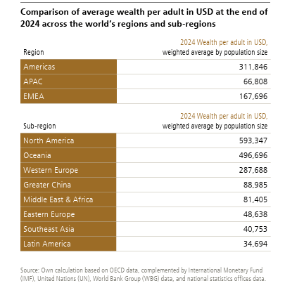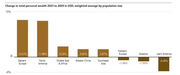 In 2024, personal wealth rose most in Eastern Europe (from a low level) and North America, but fell in Latin America, Western Europe and Oceania (Australia etc). Average household wealth in Britain fell 3.6% in 2024, the second largest drop of any major economy.