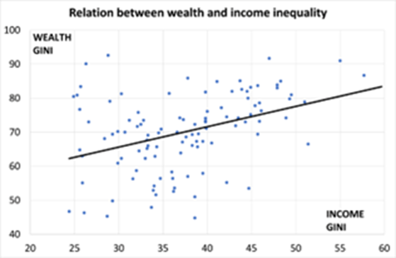 Remember these are measures of wealth, ie what is owned net of debt by each adult globally. The pyramid is not a measure of personal income inequality. But I have found in previous analyses that wealth and income are closely related. There is a positive correlation of about 0.38 between wealth and income; in other words, the higher the inequality of personal wealth in an economy, the more likely is it that the inequality of income will be higher.