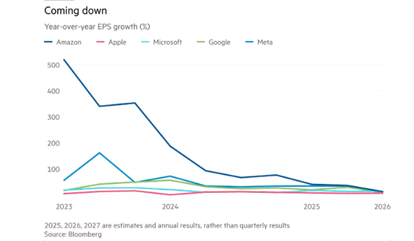 When it comes to profits from AI, the situation is even worse. Big Tech’s annual earnings growth results have been flat or slowing for the past few quarters and are expected to slow further in 2025 and 2026.