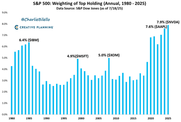The Magnificent 7 stocks — NVIDIA, Microsoft, Alphabet (Google), Apple, Meta, Tesla and Amazon — now make up around 35% of the value of the US stock market, and NVIDIA’s market value makes up about 19% of the Magnificent 7. The S&P 500 has never been more concentrated in a single stock than it is today, with Nvidia representing close to 8% of the index.