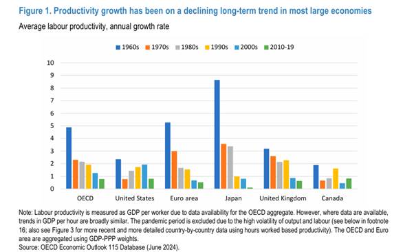 Labour productivity growth has been on a declining trend since the 1970s across the OECD and weakened further since the turn of the century. In the US, productivity picked up from the mid 1990s to the mid-2000s on the back of rising efficiency in the production of ICT equipment and the diffusion of internet-related innovations that were adopted in ICT-using sectors, notably retail. “However, this rebound was relatively short-lived and productivity growth has since then been lacklustre.”