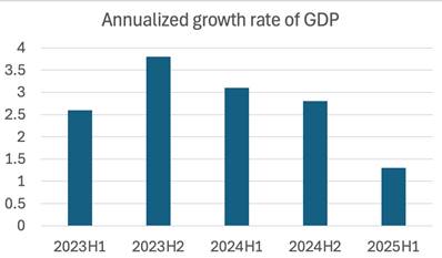 Back last February, in a post, I suggested that the US economy had a ‘whiff of stagflation’. ‘Stagflation’ is when national output and employment stagnates or rises only very slowly and yet price inflation continues to rise and even accelerate. The US economy has clearly been slowing. Quarterly growth rates have been erratic, mainly because of wild swings in imports, which surged early this year as companies tried to ‘front-run’ Trump’s import tariff increases, and then real GDP growth slowed as tariffs started to affect necessary import components for industry. But the first half of the year shows a clear slowdown under Trump.