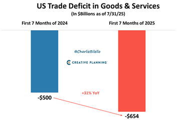 Actual tariff revenues total about $134 billion through August 2025. Meanwhile, the federal government budget deficit shows no signs of contracting – on the contrary. Trump’s Big Beautiful Bill Act passed in July promised deficit cuts, but current projections show ongoing deficits. The Congressional Budget Office (CBO) projects that the federal budget deficit in fiscal year 2025 will be $1.9 trillion. Projected tariff revenues for this year are a tiny proportion of federal government revenues, just 2.4%.