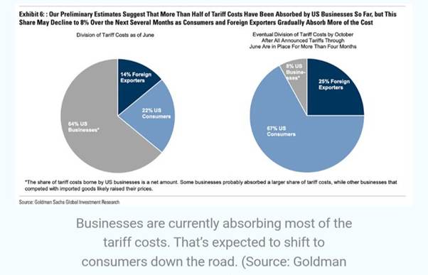 Also, some foreign exporters to the US reduced their prices to absorb the hit to import prices from the tariffs. But tariff hikes will eventually come through to consumer prices. Already, about 22% of tariff costs have been passed onto consumers, according to a Goldman Sachs analysis. GS reckon that will eventually rise to 67%.