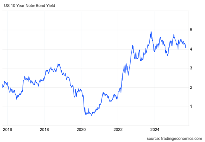 Tariff revenues are not going to reduce the annual federal government deficit currently at over 5.5% of GDP (if slowing slightly). Indeed, projections are for the annual deficits to rise to 5.9% of GDP over the next ten years, with the public debt to GDP ratio heading towards 125% of GDP. The rising public debt ratio is another worry for investors in government bonds and so will drive up bond yields whatever the Federal Reserve does to reduce short-term rates.