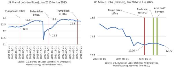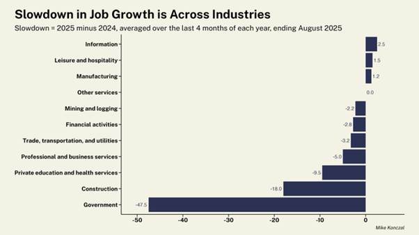 Trumponomics argued that that tariffs would build up manufacturing jobs and federal workforce cuts would free up workers for them. No chance. Manufacturing lost jobs almost as fast as the federal workforce (-12K vs -15K). Job growth is slowing across nearly all sectors.