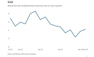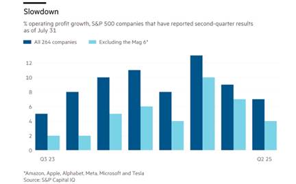 Corporate profits are still growing. Operating income for S&P 500 companies (excluding financials) grew 9% in the most recent quarter, compared with the year before. But that figure includes the mega profits of the so-called Magnificent Seven hi-tech companies. If they are excluded, then the rest of the non-financial, non-energy companies’ earnings growth is about 4-5% and slowing. Profits growth among these companies is being squeezed by rising costs of production rise. That will intensify as the imports tariffs drive up the prices of components and raw materials.