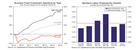 However, much of this growth in business investment is concentrated in high-tech AI spending on data centers and other infrastructure for the supposed boom in AI. Since 2019, that sector of business investment is up nearly 50%, while the rest of US corporate investment is down 7%. The impact of hi-tech, AI investment has budged up the growth rate in the productivity of labour slightly, but it is still below the rate of 1990s and 2000s. If the AI investment boom falters, then business investment will plummet.