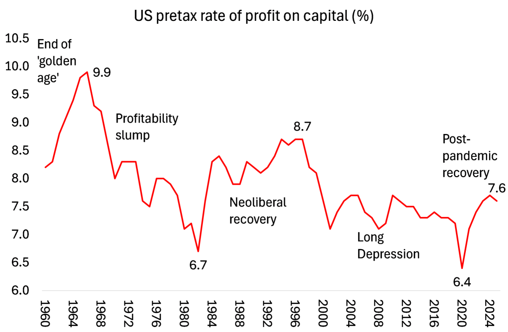 And the profitability of US capital has improved since the end of pandemic slump in 2020. According to calculations by Brian Green, the US corporate pre-tax rate of profit on capital is at a higher level than in 2006.