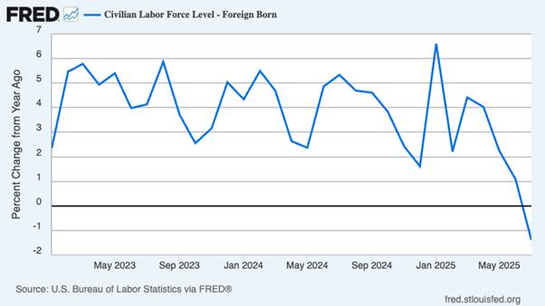 Job losses are particularly severe for men. Males have lost 56,000 jobs over the past four months. The main reason is that Trump’s attack on immigration has led to a significant fall in the labour force. The ICE is making mass arrests and deportations, but the number of foreign-born workers in the United States was already shrinking after years of rapid growth. Native-born workers have not gained from this – unemployment there is at its highest rate since the end of the pandemic. Increases in both youth and black unemployment (now at 7.5%, the highest since October ‘21) suggest that the crackdown on immigration has not created a more favourable job market for the more vulnerable components of the US labour force.