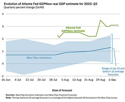 So far, the NBER has not called a recession. There are other forecasting models that try to track the rate of expansion in the US economy. The Atlanta Fed GDP Now model is popular. It is currently forecasting US real GDP to be rising 3.1% at annualised rate for the third quarter of this year – although note that the consensus of all the leading forecasters is about 1.3%.