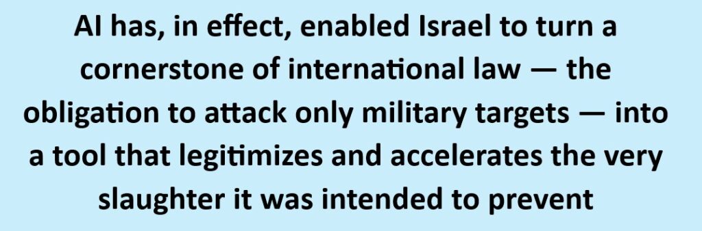 As such, they produce an endless stream of apparent military justifications, creating a veneer of legality for a policy of mass murder. AI has, in effect, enabled Israel to turn a cornerstone of international law — the obligation to attack only military targets — into a tool that legitimizes and accelerates the very slaughter it was intended to prevent.