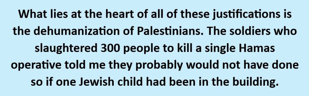 What lies at the heart of all of these justifications is the dehumanisation of Palestinians. The soldiers who slaughtered 300 people to kill a single Hamas operative told me they probably would not have done so if one Jewish child had been in the building.