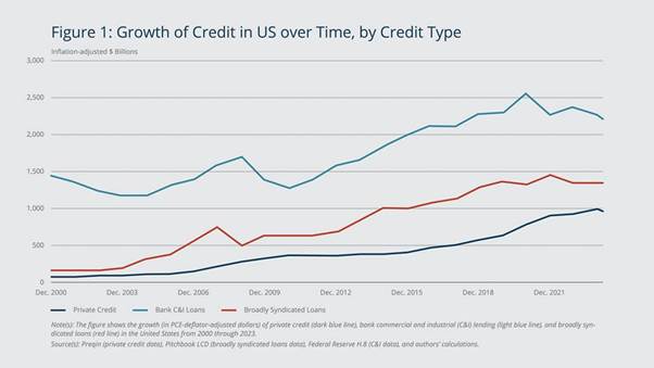 That’s the risk to the commercial banks. But increasingly, the big banks are not lending directly to companies, particularly smaller ones, but instead providing ‘liquidity’ to non-bank lenders, so-called ‘private credit’ companies. Non-bank financial institutions now account for over 10 per cent of all US bank loans. While direct on-balance-sheet funding by banks has declined sharply since 2012, the use of credit lines to non-banks has expanded significantly, now representing approximately 3% of GDP. Having grown from $500 billion in 2020 to almost $1.3 trillion today, private credit is an increasingly important source of financing for companies.