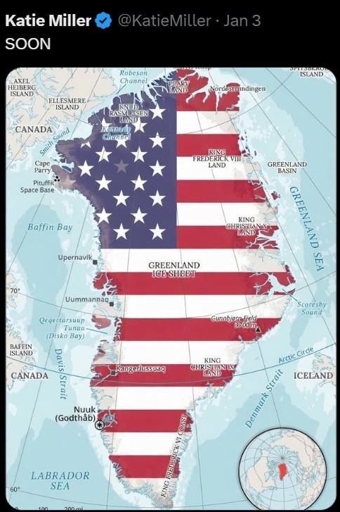 The utter contempt that this US administration shows to its ‘allies’ in Europe, and its naked aggression against Venezuela even raises the startling possibility of the USA taking over Greenland. Katie Miller, the wife of Trump’s deputy chief of staff, posted a social media picture of Greenland painted in the colours of the US flag, and the word “SOON”, eliciting protests from Denmark’s Prime Minister.