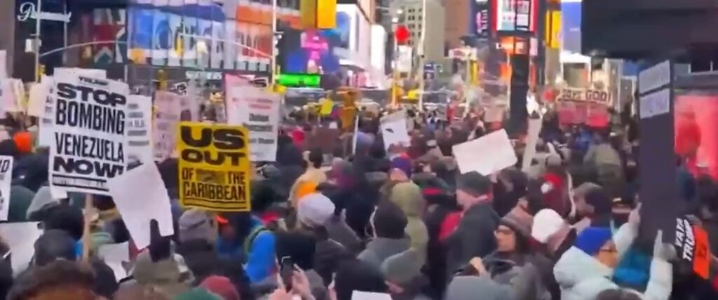 A new YouGov poll taken after the raid on Caracas and the seizure of Maduro – when patriotic fervour might expected to have been boosted by Trump’s boastful press conference – more Americans opposed the venture than supported it. (See inset above). With a situation in Venezuela still very unstable and uncertain, there is not much likelihood that the poll numbers will improve for Trump. On Sunday, there were already numerous demonstrations in US cities against the undeclared war on Venezuela