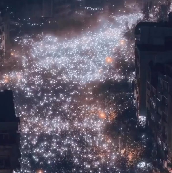 A night-time demonstration lit by thousands of mobile phones