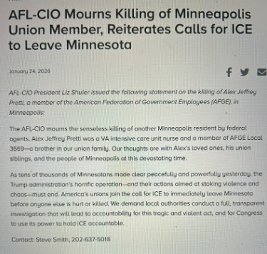 “America’s unions” he writes, “join the call for ICE to immediately leave Minnesota before anyone else is hurt or killed. We demand local authorities conduct a full, transparent investigation that will lead to accountability for this tragic and violent act, and for Congress to use its power to hold ICE accountable.”