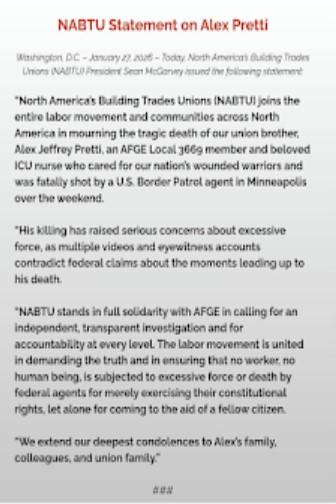 The statement from Sean McGarvey, the president of NABTU, is very similar to Liz Schuler’s statement as head of the AFL-CIO in that they “mourn the senseless killing” of another Minneapolis resident.