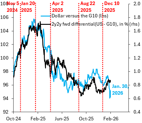 Another key indicator here is the differential between the interest rate received on the dollar compared to that received on other currencies, particularly the euro and the yen. Financial investors increasingly reckon that US interest rates will fall more than in other major economies over the next year or so. The Bank of England and the European Central Bank are in no hurry to cut their rates further – as they just announced at their meetings today – while the Bank of Japan is set to hike its rate further to support the yen. So the ‘forward’ (ie market forecast) differential interest rate for the dollar compared to other currencies has been dropping.