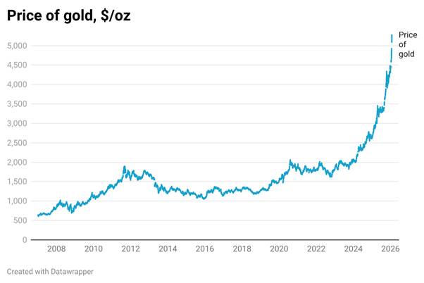 The gold price against the US dollar is back above $5,000 per oz after its recent short sharp contraction last week. The unprecedented rise in the gold price, particularly since the beginning of the Trump Mark 2 presidency one year ago, is the result of what is being called the ‘debasement trade’. This trade means that financial institutions, both public and private, are apparently trading out of US financial assets ie dollar cash and dollar debt, in particular. Why? It seems that financial investors and speculators, both foreign and American, fear that the dollar value of the assets that they own will fall. Why? For several reasons.