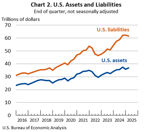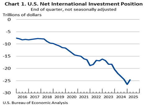 Trump’s plan to restore American industrial superiority with tariffs and bombs will not succeed. The relative decline of US industry will not be reversed. But what about that financial decline? We can see what is happening there if we look at the net international investment position (NIIP) of the US economy. This measures the amount of foreign assets held by US institutions against the amount of US assets held by foreign institutions, ie the net position of US foreign assets and liabilities. What are these assets and liabilities? They are the outstanding direct investments held; outstanding holdings of stocks (equities) and bonds; and holdings of cash and short-term securities.