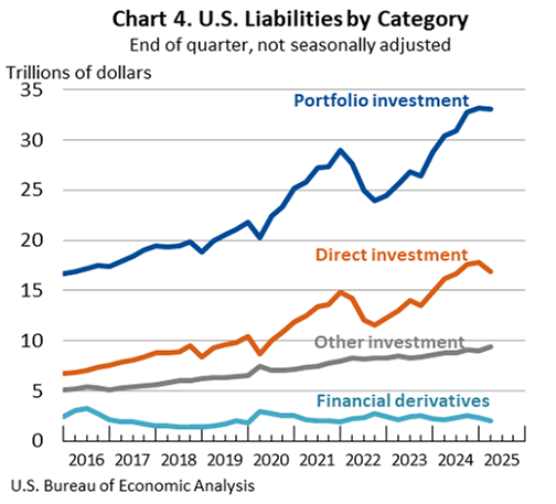 But that gap between liabilities and assets has been growing. Why? It is not because foreigners are investing in US industry so much. It’s true that net FDI investment by foreigners into the US has increased sharply since the mid-2010s, now reaching nearly $7trn in investment stock. But the major part of foreign holdings of dollar assets is in what are called portfolio investments: ie bonds and stocks (shares).