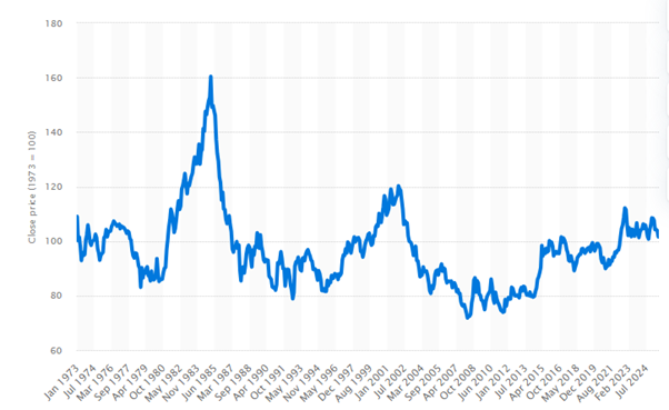 Even so, the underlying decline in US industrial power has weakened the dollar over decades – indeed this is what Trump sees as needing to be reversed. He wants to ‘Make America Great Again’ by restoring its industrial hegemony; and his weapons are tariff hikes and bombastic blustering threats.