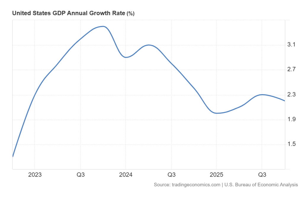 The US economy expanded only at an annualised 1.4% in Q4 2025, well below forecasts of 3%, the advance estimate of real GDP showed. And over the whole 2025, the US economy expanded 2.2%, or below the 2.4% rate in 2024. The boasting of Trump and his advisers of a US boom doesn’t look quite so convincing after these data. Investment in equipment and software products rose more than 8% in 2025, probably the result of the AI investment boom. Without that, US real GDP growth would have been well under 2% during last year.