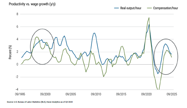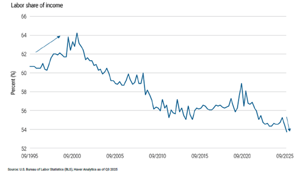 But this time is different. Workers’ real wage growth in 2025 slowed to a pace barely above 1%. This helped drive down labour’s share of U.S. income to its lowest level in decades of reported history.