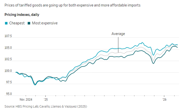 The tariffs on food imports have risen 44%, in effect, a 12% tax on consumers. This analysis was backed up by the New York Federal Reserve, which concluded that “US import prices for goods subject to the average tariff increased by 11 percent … more than those for goods not subject to tariffs” and“U.S. firms and consumers continue to bear the bulk of the economic burden of the high tariffs imposed in 2025.” Higher tariffs, labour and health-insurance costs had pushed many businesses to raise prices. “After holding the line on prices for several months, companies—big and small—have begun a new round of increases, in some cases by high-single-digits.”